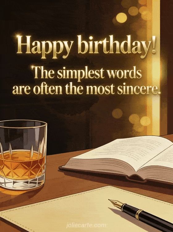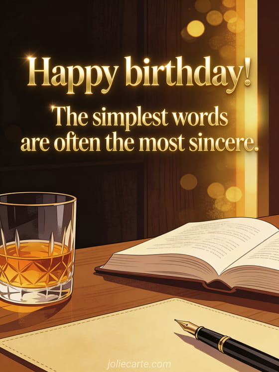 This elegant birthday card for men features a refined masculine desk with a glass of amber whisky, an open book and a fountain pen bathed in warm golden side light. The sincere message reminds him that the simplest words are often the most heartfelt. Discover also a free birthday card for him or a funny birthday humor for a man.