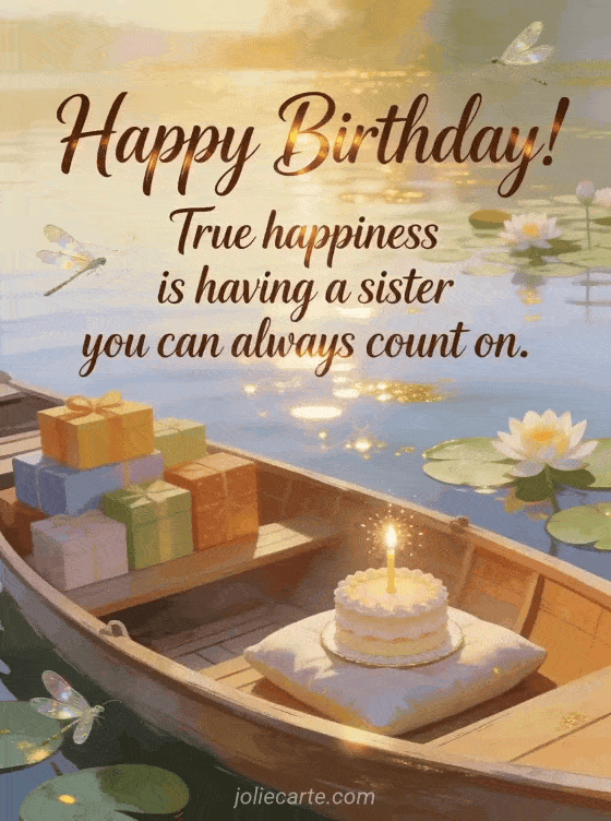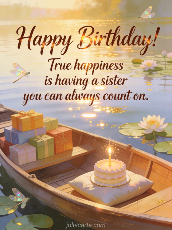 Celebrate your sister's birthday with this poetic card featuring a wooden boat on a calm lake with water lilies, colorful gifts and an elegant birthday cake with a sparkling candle in golden morning light. Discover also a birthday card for sister or a birthday card for a sister.