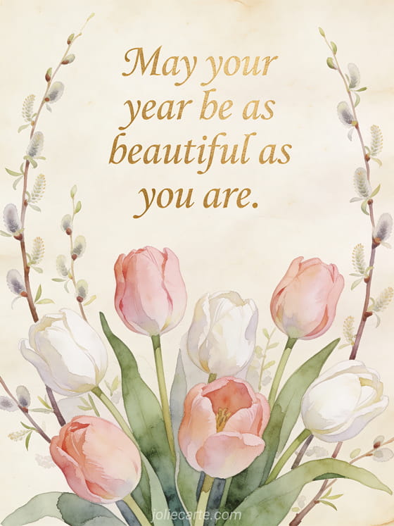 Send a refined birthday card with a watercolor arrangement of pink and white tulips with willow branches on a parchment background and the message May your year be as beautiful as you are. Discover also a happy birthday gif for women or birthday gifs for women.