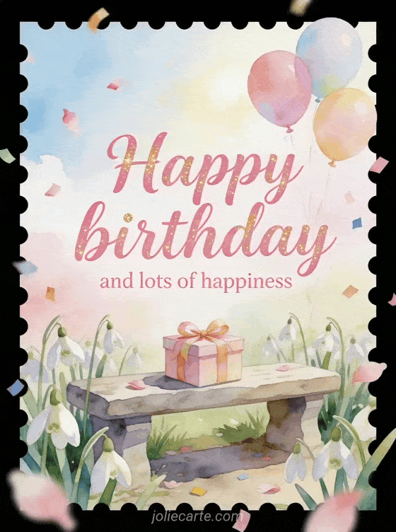 Share a gentle birthday wish with rosy watercolor lettering, gold sparkle, snowdrops, a ribboned gift box, pastel balloons, and fresh morning light. You can also send a happy birthday mom animated gif, a text to say happy birthday to your mom, or an animated happy birthday mom gif gif.