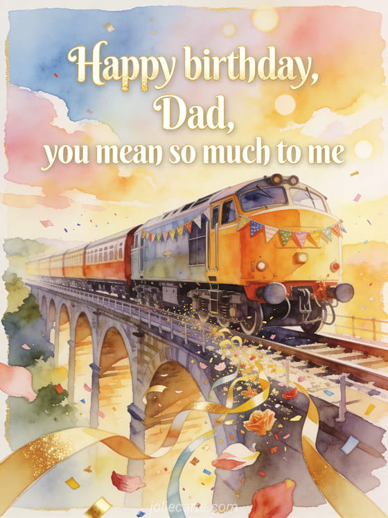 Send a birthday letter for his dad with luminous ivory lettering, a bright vintage train decorated with bunting crossing a sunny viaduct, plus ribbons, petals and confetti over the border. Discover also a happy birthday stepdad card, dad I wish you a happy birthday or a happy birthday dad card.
