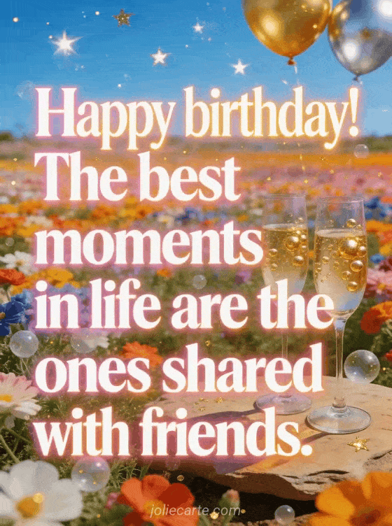 Happy birthday! The best moments are the ones shared with friends. a festive birthday card with a wildflower superbloom and champagne