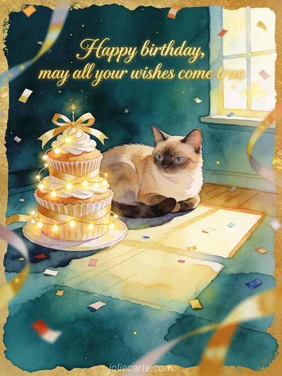 Share a cozy watercolor birthday card with an exotic shorthair cat curled beside a ribboned cupcake tower and glowing garlands in a sunny room, with confetti and streamers. Discover also a son's birthday, a happy birthday my son gifs, or a free birthday card for my son.