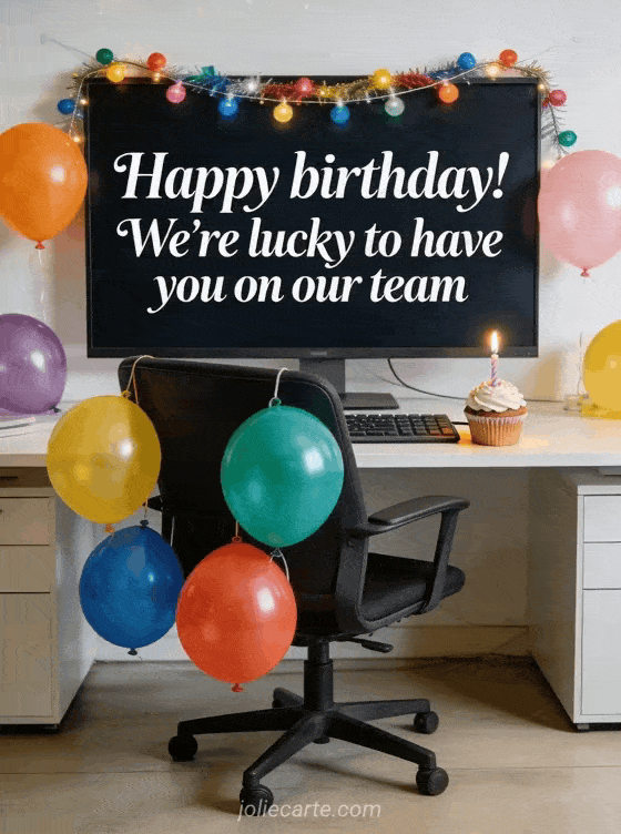 Share a thoughtful birthday message for a work colleague with a festive desk, colorful balloons, a garland and a cupcake with a candle. You can also send a happy birthday from a female work colleague, a happy birthday to my female work colleague or a happy birthday work colleague card.