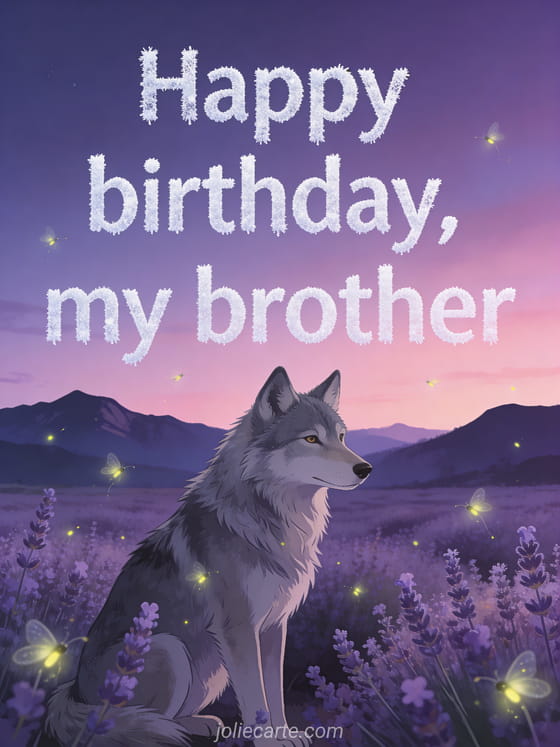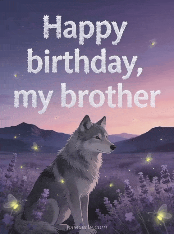 Wish your brother a peaceful birthday with a gray wolf in a blooming lavender meadow under a violet and pink twilight sky, with fireflies and distant mountains. You can also share a happy birthday my brother gif, a little brother happy birthday my brother gif or a happy birthday my dear brother card.