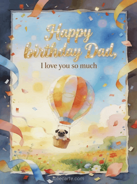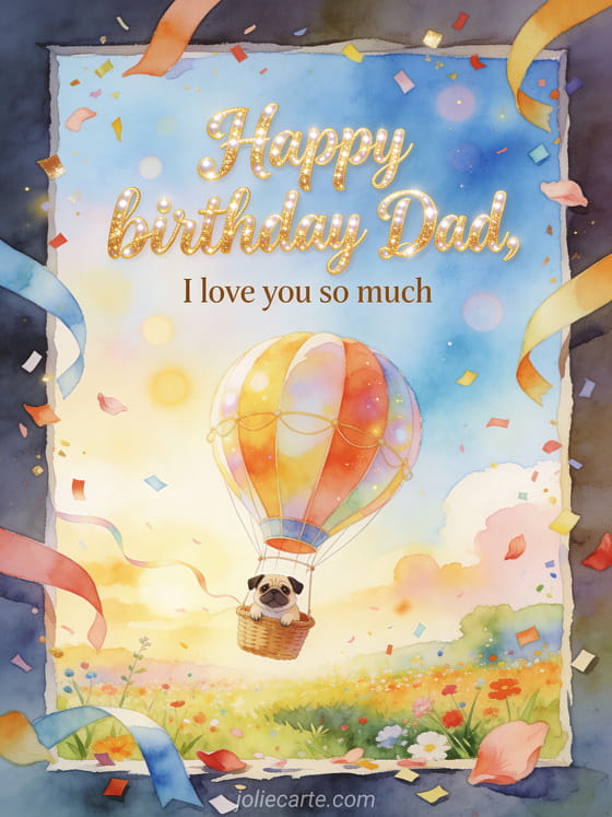 Send a birthday poem for dad I love you with flowing pearl lettering, a whimsical hot air balloon above a festive meadow, a pug in the basket and ribbons, petals and confetti over the border. Discover also a poem for his dad for his birthday, a free dad birthday poem or a poem for dad for his birthday.