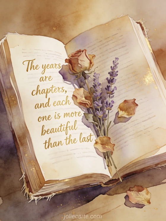 Celebrate her birthday with this poetic quote: "The years are chapters, and each one is more beautiful than the last." This card features an open book with dried flowers, rose petals and lavender sprigs in a refined watercolor illustration. Discover also a birthday text for her or a happy birthday classy woman.