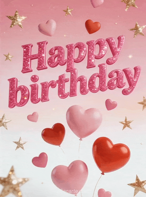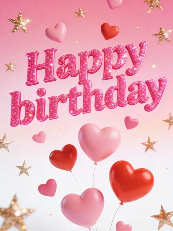 Send a cheerful birthday card featuring bright pink glittery letters, floating pink and red hearts and golden sparkling stars on a gradient pink background. Discover also a free birthday card for women or a birthday card text for women.