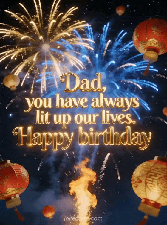 Share a meaningful birthday text for his dad with luminous gold lettering, brilliant gold and blue fireworks, floating red and gold lanterns and a magical festive night sky. Discover also a funny happy birthday dad humorous, a child birthday drawing dad or a happy birthday dad image.