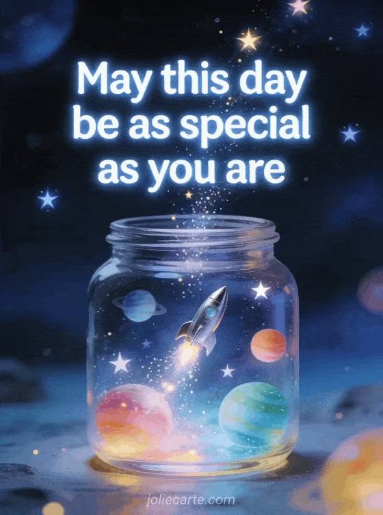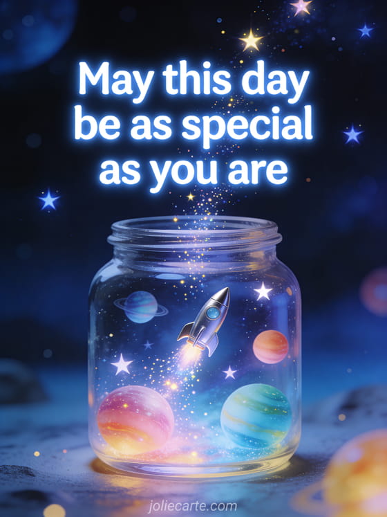 Send a dreamy birthday text for your grandson with a glass jar holding a tiny universe of colorful planets, sparkling stars and a little rocket. Discover also a happy birthday my beloved grandson, a winter sales 2022 Auchan or a birthday text for my grandson.