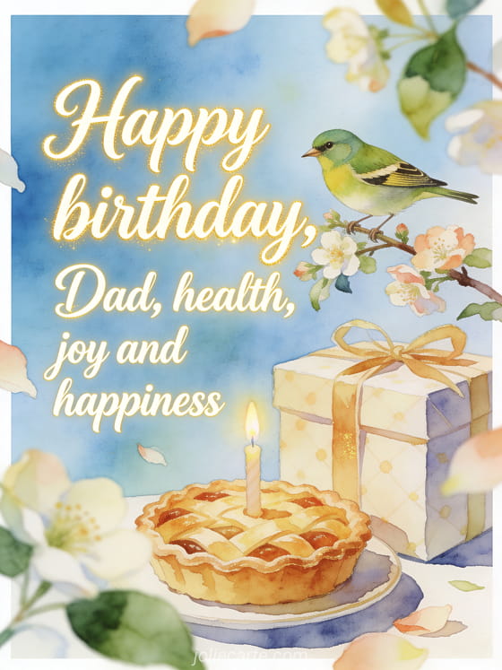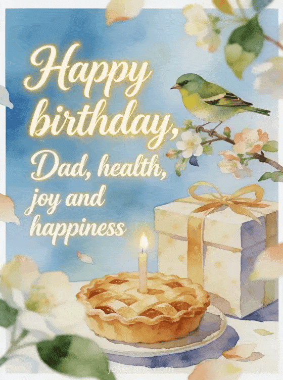Share a birthday text for your dad with a greenfinch perched on flowering branches above a wrapped present and a candlelit tart. You can also send happy birthday dad gif, fathers happy birthday dad touching text or happy birthday dad photo montage.