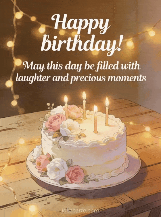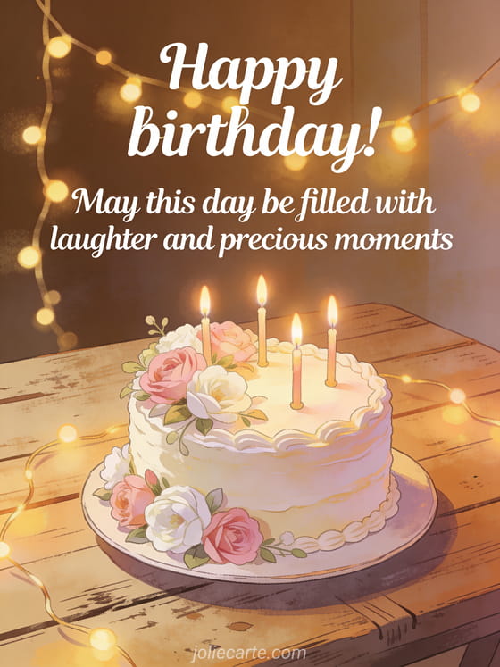 Send this beautiful birthday wishes phrases card with an elegant cake decorated with edible flowers on a rustic wooden table, sparkling candles and warm fairy lights. Discover also a happy birthday words or a happy birthday champagne glass.