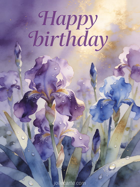 Share a poetic birthday card with violet and blue irises, golden morning light, and a graceful watercolor look. You can also browse birthday woman photo free, happy birthday woman image, and birthday woman image.