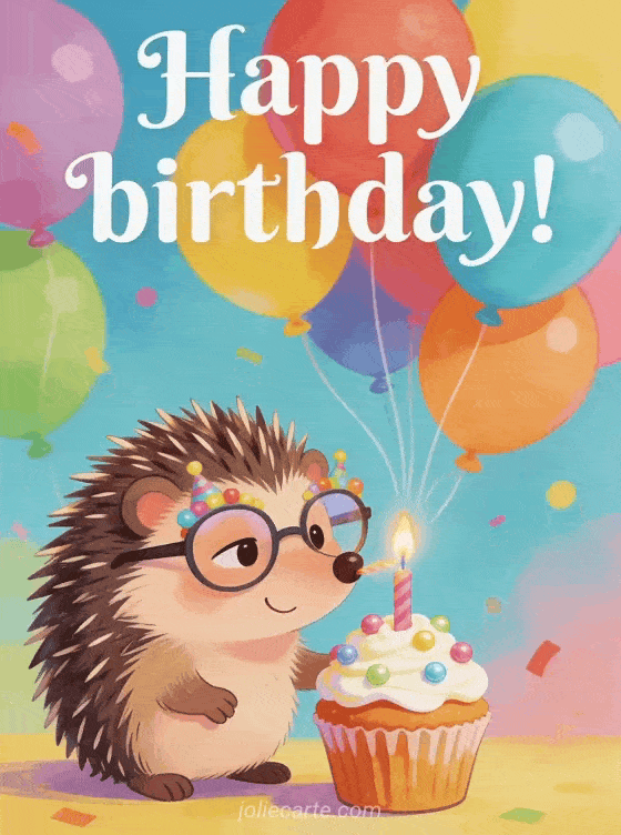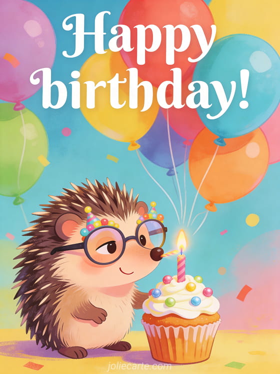 Make someone smile with this humorous birthday card featuring a hedgehog, balloons, and a cupcake with candles. You can also browse happy birthday card female, birthday card woman beach, and birthday cards woman.