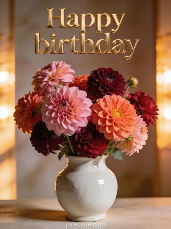 Share a graceful birthday card with lush dahlias and a warm, soft atmosphere to celebrate beautifully. You can also discover happy birthday woman image, birthday woman image, and birthday card message woman.