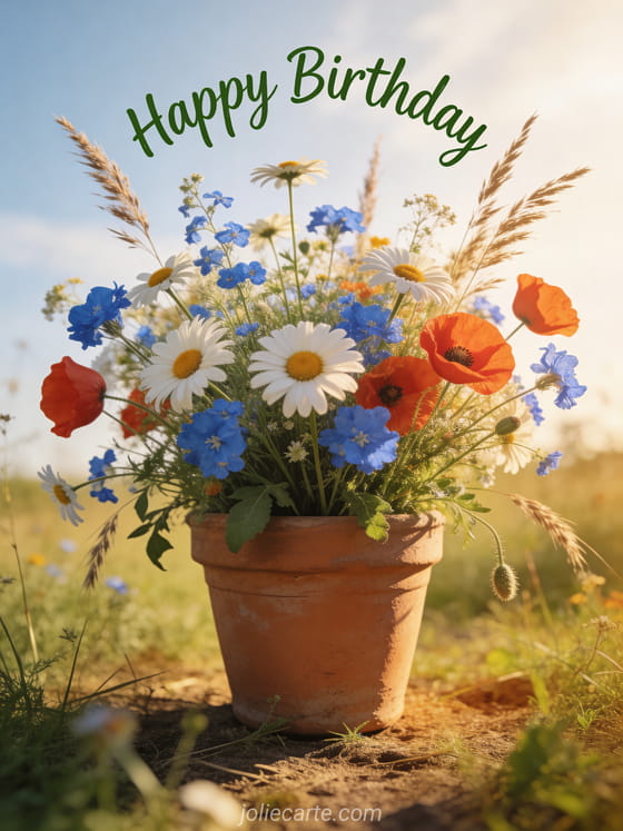 Celebrate her birthday with this charming card featuring a magnificent bouquet of wildflowers including daisies, cornflowers and poppies in a terracotta pot bathed in golden light. Discover also a peony birthday card for women, a happy birthday bouquet for her or birthday flowers for women.