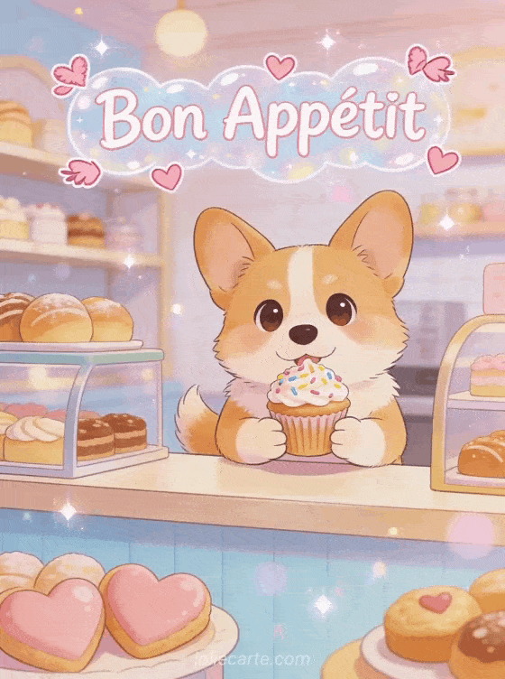 Share a sweet bon appétit greeting with this charming corgi gif card full of hearts and good vibes. Discover also a meal bon appétit image card or a bon appétit gif image card.