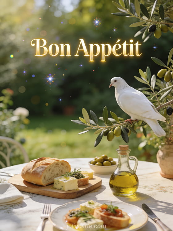 Share a graceful bon appétit greeting with this peaceful card featuring a white dove and Mediterranean spread. Discover also a bon appétit card or a bon appétit gif kisses card.