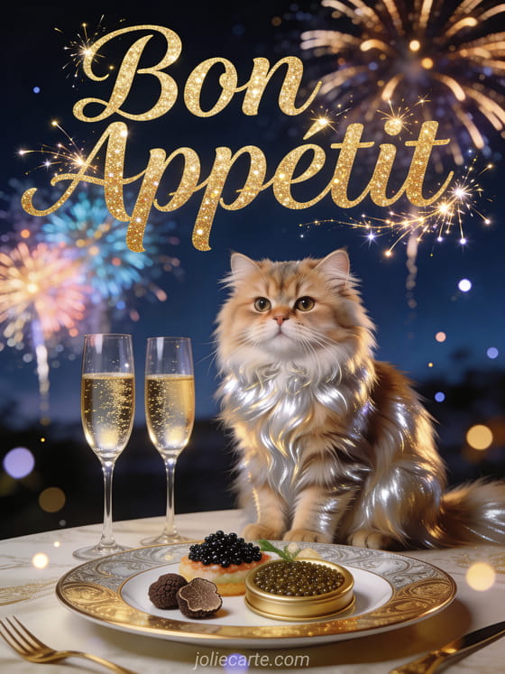Send a dazzling bon appétit greeting for New Year's Eve and make someone's celebration even more special. Discover also a bon appétit gif kisses card, a meal bon appetit image card or a bon appetit christmas image card.