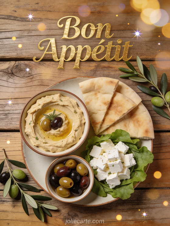 Share the joy of a beautiful meal with this elegant mediterranean spread card. You might also enjoy a bon appétit humor image or a bon appétit gif.