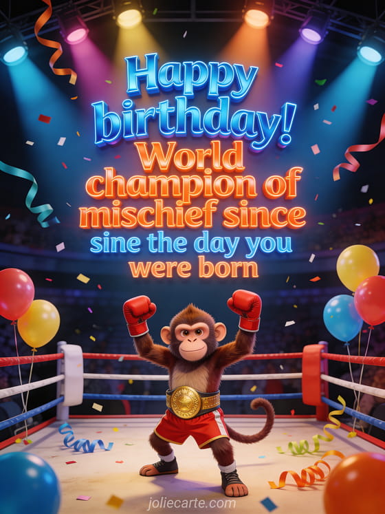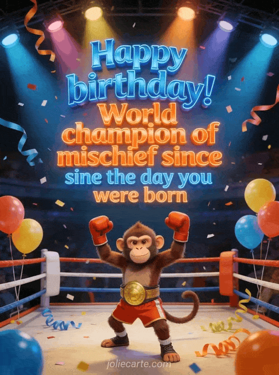 Make him laugh with a birthday card featuring a monkey world champion boxer posing on a ring with golden belt and confetti raining down. Discover also a funny happy birthday dog card or a funny happy birthday gif.