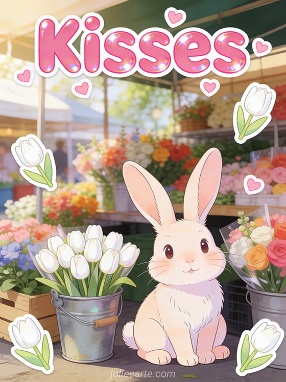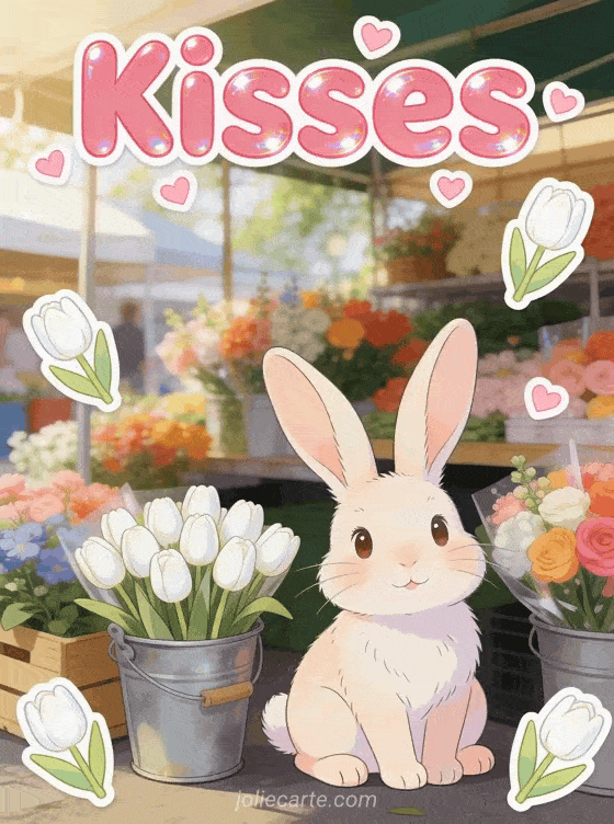Share sweet kisses with this charming spring-themed greeting card featuring a bunny in a flower market. You might also enjoy a pretty kisses card or fish kisses gif for more tender kisses greetings.