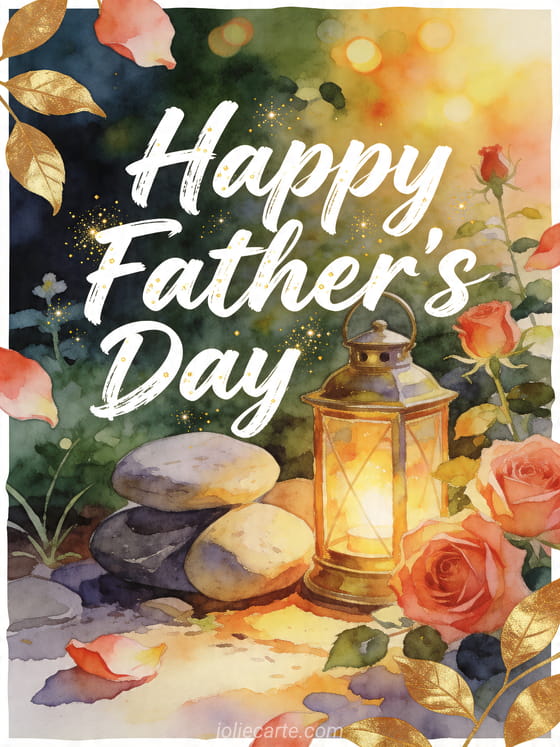 Send a warm card for Father's Day with a richly colored watercolor illustration of a brass lantern glowing beside smooth river stones, rose blooms and golden leaves in a sunny garden nook. Discover also Father's Day poem my heart tells me, a free fathers day card or Father's Day cards.