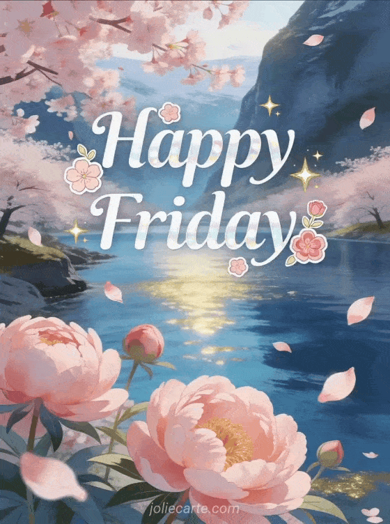 Share a delicate happy friday card with elegant white pearly lettering, small pink flowers, sparkling stars, cherry blossoms above a deep blue fjord and pink peonies blooming in the foreground. See also good morning it's friday humor, this good day friday card or a zen happy friday quote.