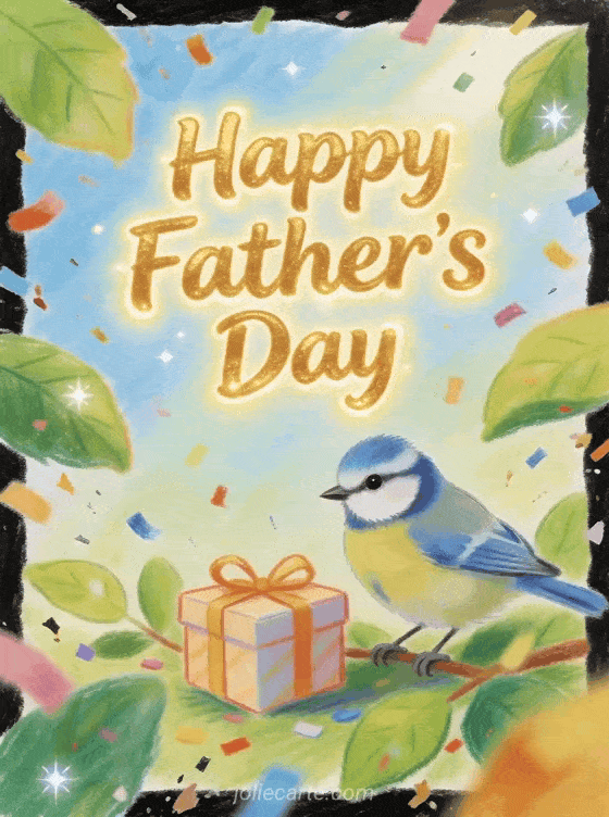 Send a joyful card of Father's Day with a cheerful colored pencil illustration of a blue tit perched beside a small wrapped gift among bright green leaves and colorful confetti. Discover also sweet words Father's Day, good sunday father's day or joyful father's day my love.