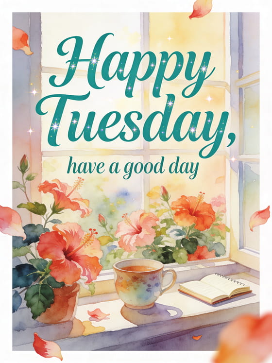 Send a warm happy Tuesday and good day greeting with a cozy windowsill filled with hibiscus blossoms, a ceramic tea cup and a small open notebook. Discover also an image to wish a happy Tuesday, a Tuesday good morning image or a cold happy Tuesday image.