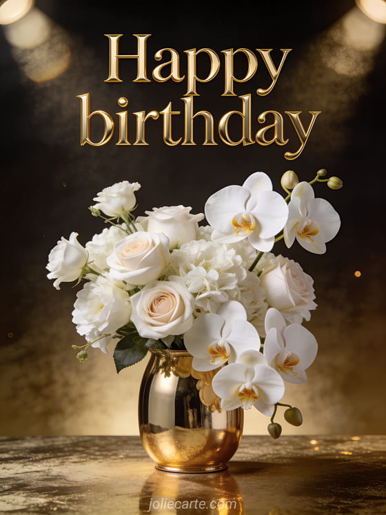 Share this photorealistic birthday card featuring orchids and roses in a golden vase on a dark elegant background. You can also browse friendship friend friendship happy birthday woman, rose for birthday woman, and free happy birthday woman image.