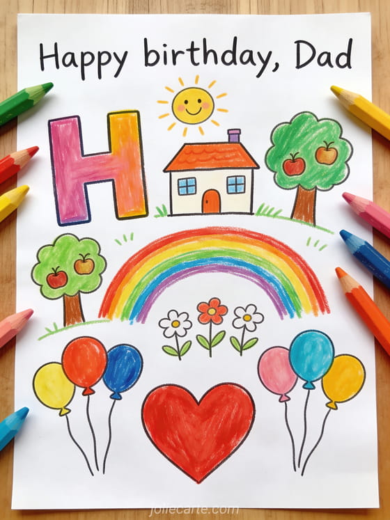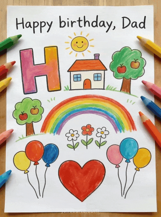 Share a child birthday drawing dad card with colorful crayon letters, a little house, smiling sun, apple trees, rainbow, flowers, balloons and a big red heart. Discover also a happy birthday dad image, a your daughter happy birthday dad or a happy birthday dad I love you.