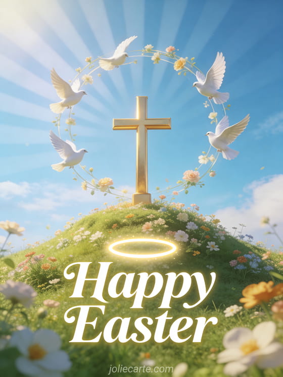 Celebrate the joy of Easter with this luminous religious card featuring a golden cross surrounded by white doves on a spring hillside. You may also enjoy a religious happy Easter greeting.