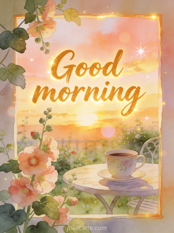 Share a bright morning card with honey-colored lettering, hollyhock blossoms over the border, a porcelain coffee cup on a garden table and a peach-gold sunrise. You can also send morning coffee coffee morning good morning, good morning hello coffee or sparkling good morning coffee gif.
