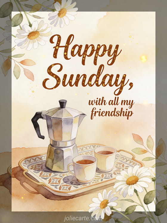Share a friendly happy Sunday with a moka coffee pot, two small cups, a patterned breakfast tray and daisies in warm watercolor light. Discover also pretty happy Sunday cards, beautiful animated happy Sunday images or happy Sunday wish image.