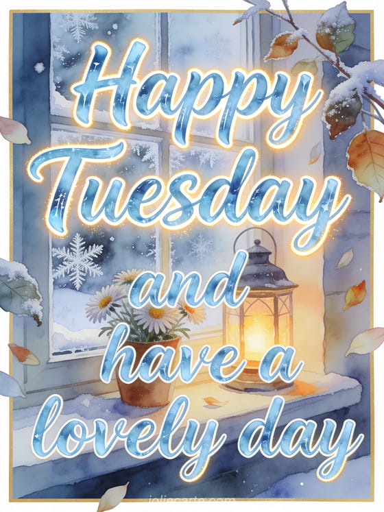 Send a bright winter Tuesday greeting with icy blue calligraphy, a glowing lantern, frost on the window, aster flowers and cozy warmth. Discover also beautiful images for happy Tuesday, a good morning Tuesday animated gif or a happy Tuesday coffee image.