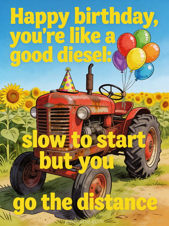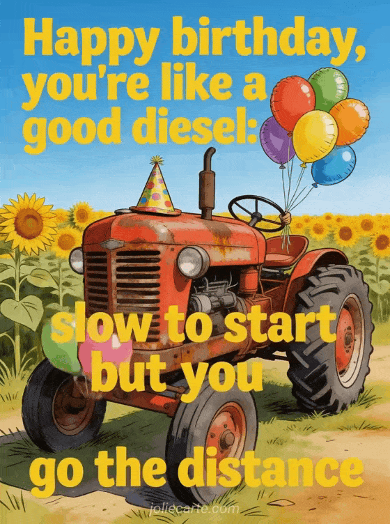Share this funny birthday card with a lovable old tractor, colorful balloons, and a big joke about getting older. You can also discover birthday man funny free gif, happy birthday man funny gif, and nice birthday card man.
