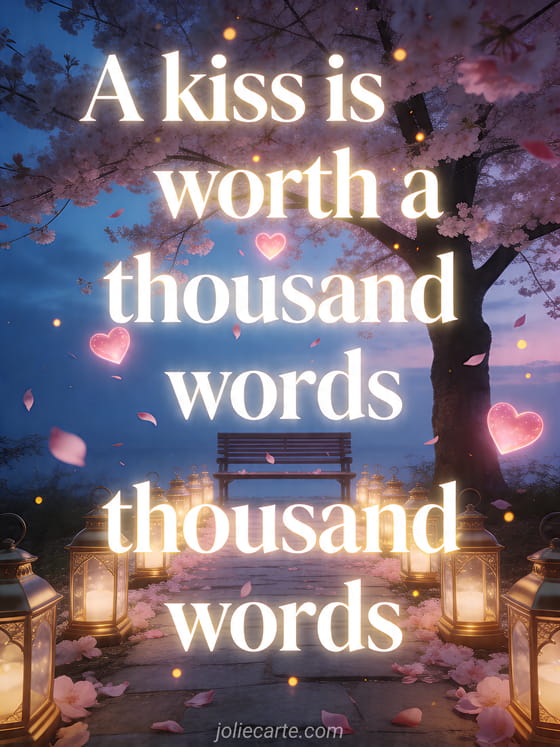 Celebrate love with this free kiss quote card inspired by lantern light, cherry blossoms and a dreamy twilight path. Discover also tender kiss page, tenderness heart kisses good night or tender kisses image.