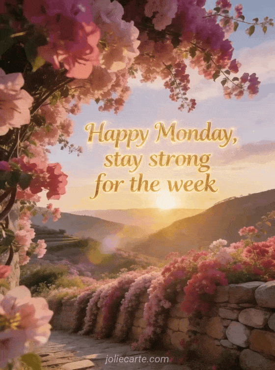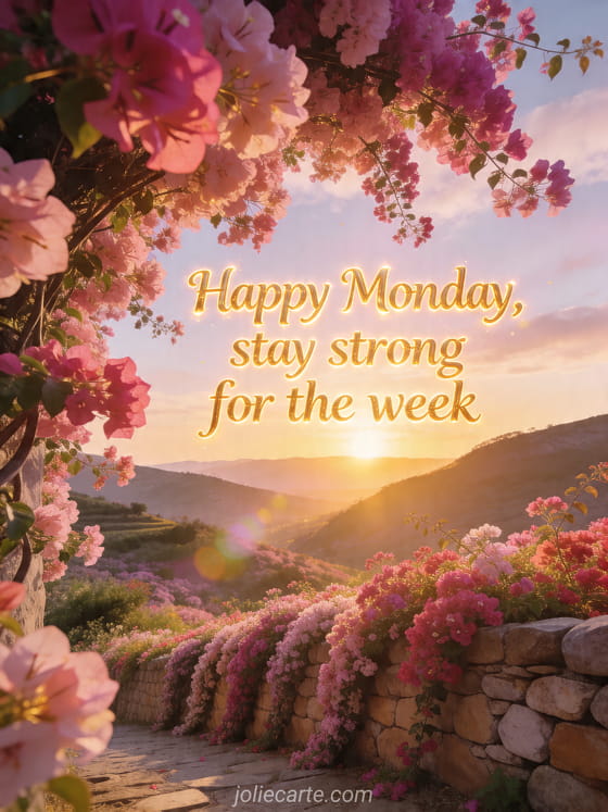 Motivate someone for the week with this uplifting Monday card showing a flower-filled valley at golden sunrise, cascading bougainvillea and warm panoramic morning light. You can also discover monday good morning funny, a happy monday or good morning happy monday good week kisses.