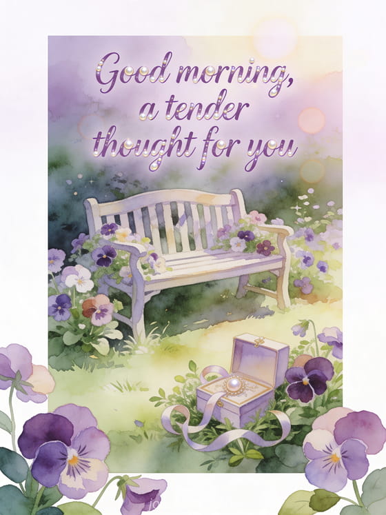 Send a cute good morning message with a soft violet watercolor scene of a garden bench, pansies, ribbon curls and a tiny keepsake box among fresh greenery. This tender card shares a sweet thought for someone special, and you can also discover an early morning good morning message, say hello or a beautiful good morning message.