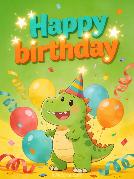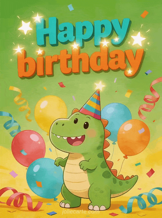 Celebrate with this cyber birthday cards child inspired design, featuring a joyful green dinosaur with a party hat, colorful balloons, streamers, and confetti on a vibrant green and yellow background. You can also discover free birthday card child, happy birthday baby banner, and happy birthday baby gif.
