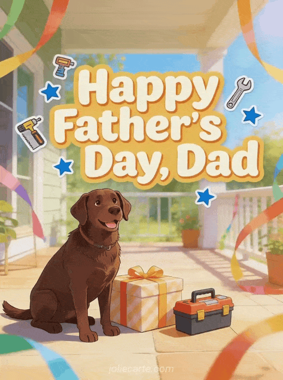 Send a Dad Father's Day card with playful cream lettering, tool icon stickers, blue stars, a cheerful chocolate labrador beside a wrapped gift, a tiny toolbox and colorful streamers on a bright patio. Discover also a free Father's Day card, a happy father's day dad image or sweet words for father's day.