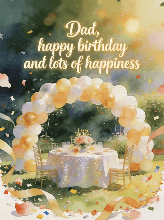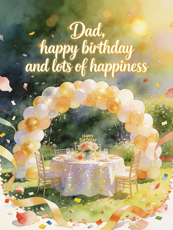 Send dad I wish you a happy birthday with refined cream lettering, a grand balloon arch around a sparkling birthday table in a sunny garden, plus petals, ribbons and confetti spilling over the border. Discover also a happy birthday dad card, a happy birthday dad animated images or a birthday poem dad child.