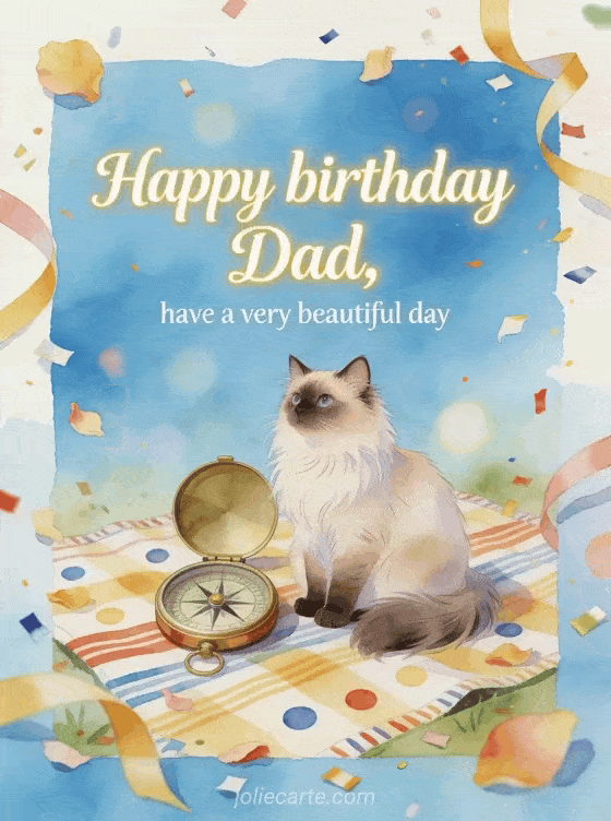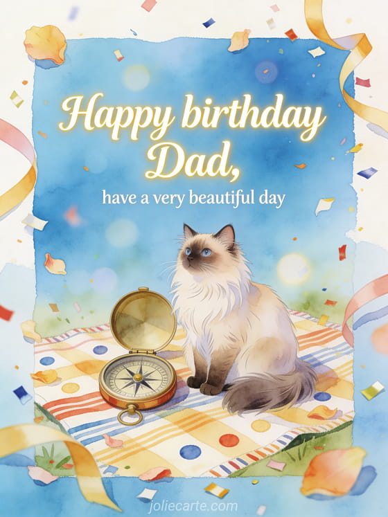 Send a dad's birthday greeting with a bright watercolor Turkish Angora cat beside an open compass on a festive picnic blanket. You can also share dad birthday drawing, your daughter happy birthday dad from your daughter or happy birthday dad I love you gif.