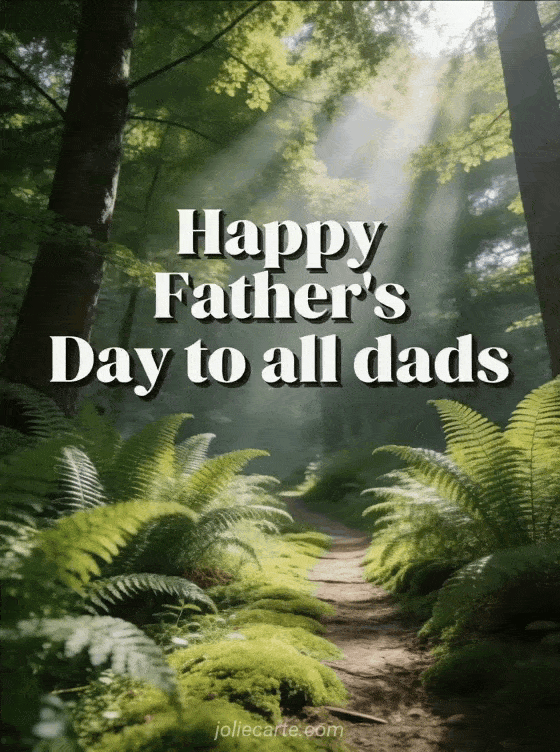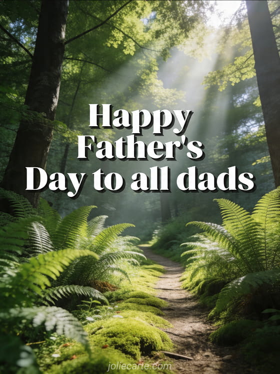 Send a dad's day card with a bright spring forest path, green ferns on both sides, moss underfoot and sunlight filtering through the canopy. Discover also happy father's day to my son and all dads, Father's Day text or a fathers day card template.