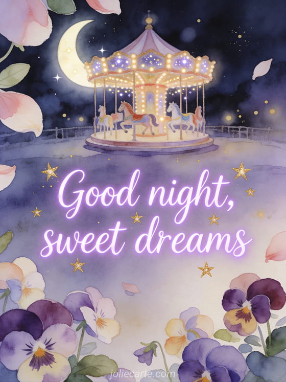 Send a darling good night message with lilac lettering, tiny golden stars, a small carousel under a crescent moon and pansy petals crossing the border. Discover also this pretty message to say good night, this good night message for her man or this sweet good night message.