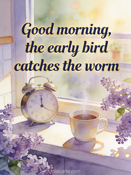 Send an early morning good morning message with crisp navy watercolor lettering, a cheerful kitchen windowsill, a vintage alarm clock, a steaming cup and fresh lilac branches. Discover also animated virtual good morning card, a good morning message for my girlfriend or free good morning cards.