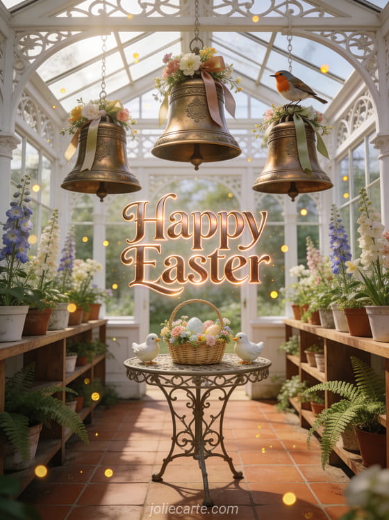 Send this stunning image of Easter bells hanging in a Victorian conservatory decorated with spring flowers and a charming robin. Discover also an Easter card, a free Easter card or an Easter greeting card.