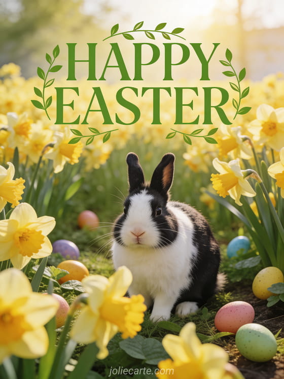 Share a lovely Easter bunny image with a cute Dutch dwarf rabbit among daffodils and scattered colorful Easter eggs. Discover also Easter flowers images or a Happy Easter holiday text.