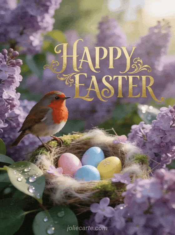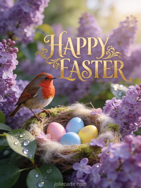 Share the magic of Easter with this tender free card featuring a robin bird and spring flowers. Discover also Easter gifs or animated Happy Easter images.